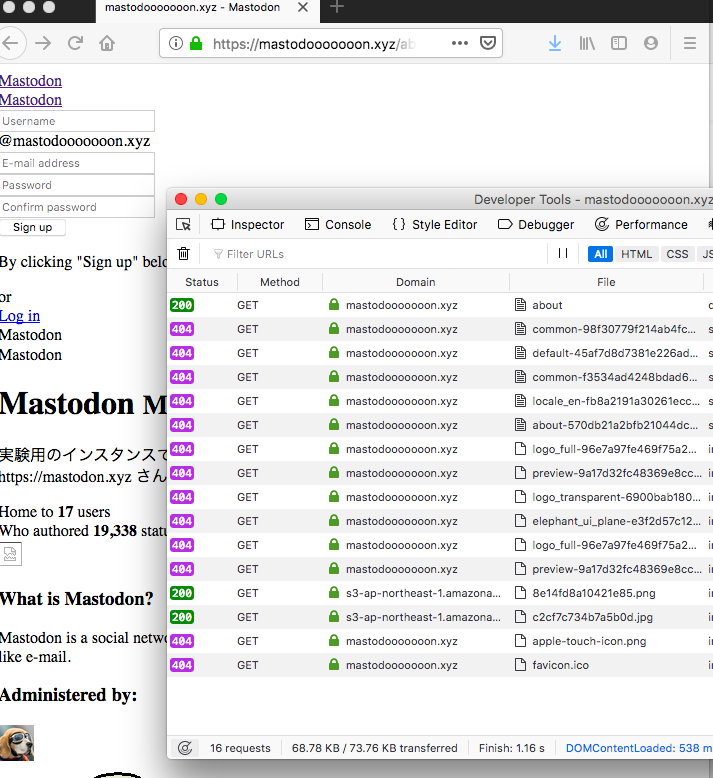 @estpls たとえば https://mastodooooooon.xyz/about を閲覧して Command-U とかでソースを覗くと https://mastodooooooon .xyz/packs/logo_full-96e7a97fe469f75a23a74852b2478fa3.svg へのリンクがあるのだけれど、このURLからは404が返ってきてます(curlコマンドが便利、.xyzの前にスペースを追加してます)。サーバのどこかにこのファイルがあるならアセットのコンパイルは成功してるのでたぶんNginxの設定を確認してこのファイルが見えるようにして、ファイルがなければアセットのコンパイルが失敗してそうだと想像できます。