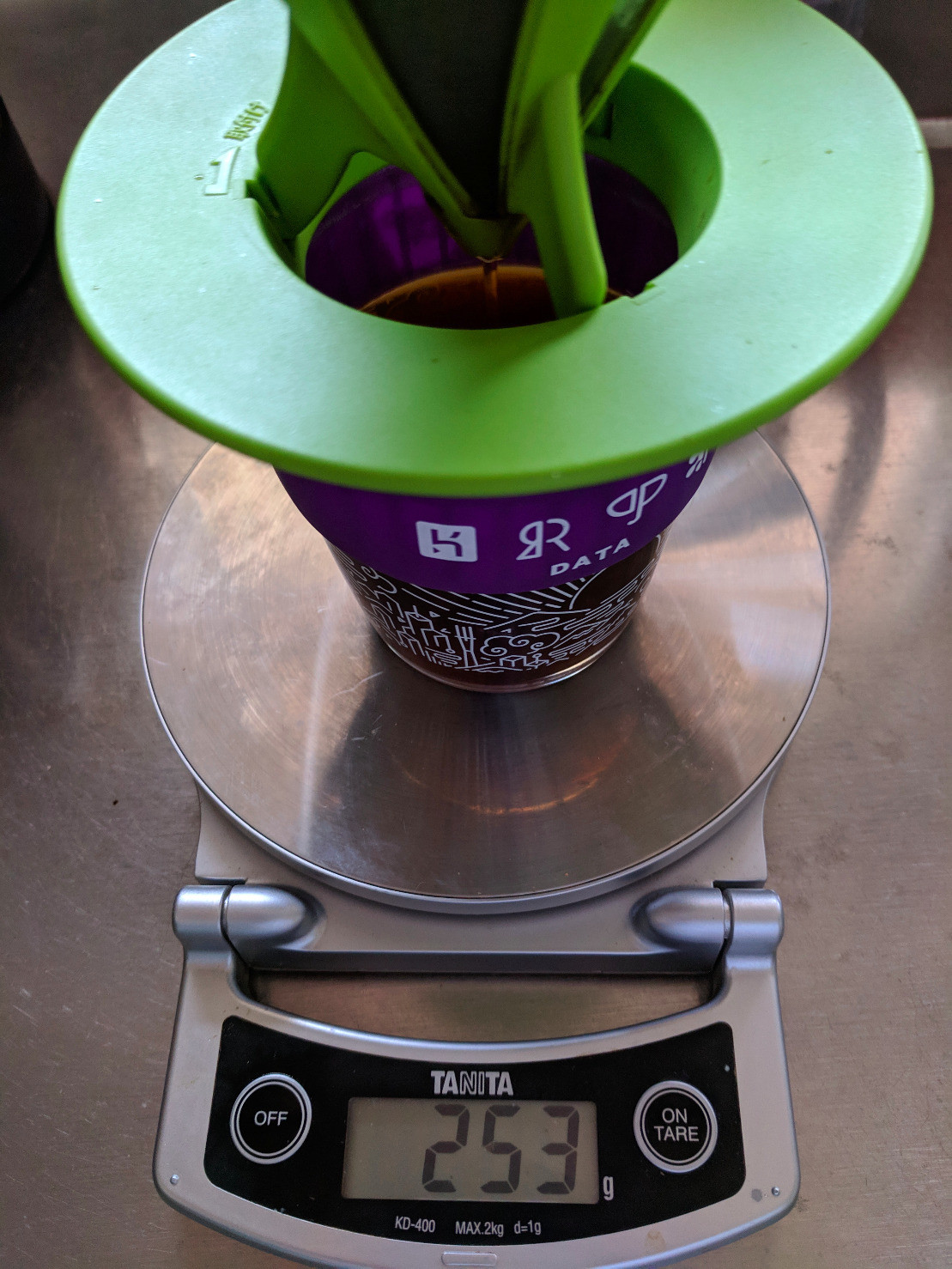 本日のふるったメルカドン。同じスプーン(大)で測ったんだけど今日は13gにんりました。1分間蒸らしてから金属メッシュで253gのお湯を2回に分けて抽出しました。どんな味になるかしら♪