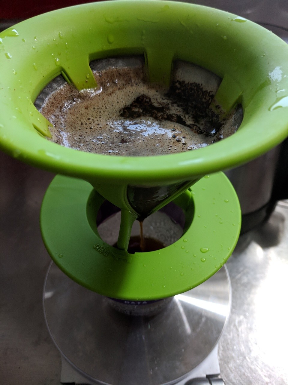 フルッタメルカドンさん12gを1分間蒸らしてからHeroku Postgresにむけて金属メッシュ経由で合計285gのお湯を3回に分けて注いで6分かけて抽出しました。時間かかりすぎるようなので挽きを荒くしないとね。