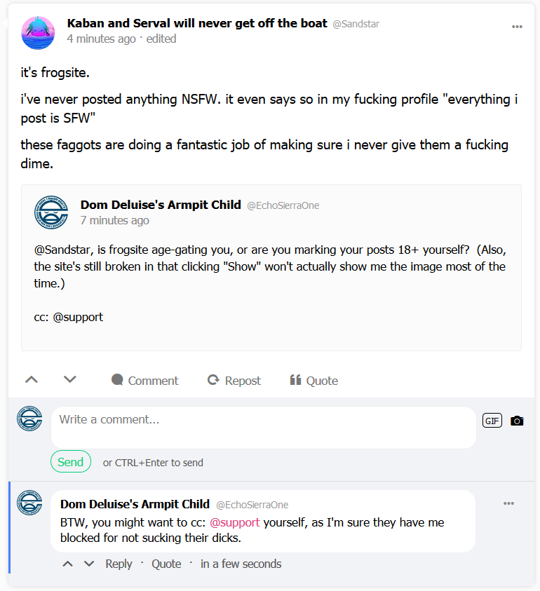 Turbocuck trying to blatantly lie some more. He *did,” afterall, get rid of the frog logo in order to change the site’s “brand identity.” He deleted this post before anyone could point this out, but I got a screenshot.