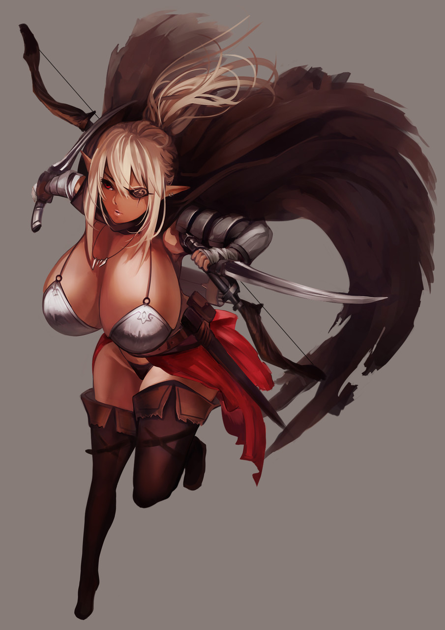 @KotaniMadoka 自分の好きなヤツ全部つぎ込んでます 褐色 エルフ 爆乳 眼帯 ポニーテール クール系美人