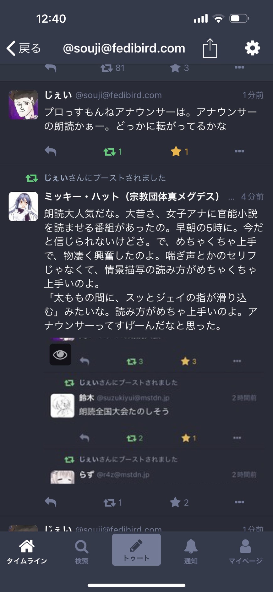 朗読大人気だな。大昔さ、女子アナに官能小説を読ませる番組があったの。早朝の5時に。今だと信じられないけどさ。で、めちゃくちゃ上手で、物凄く興奮したのよ。喘ぎ声とかのセリフじゃなくて、情景描写の読み方がめちゃくちゃ上手いのよ。