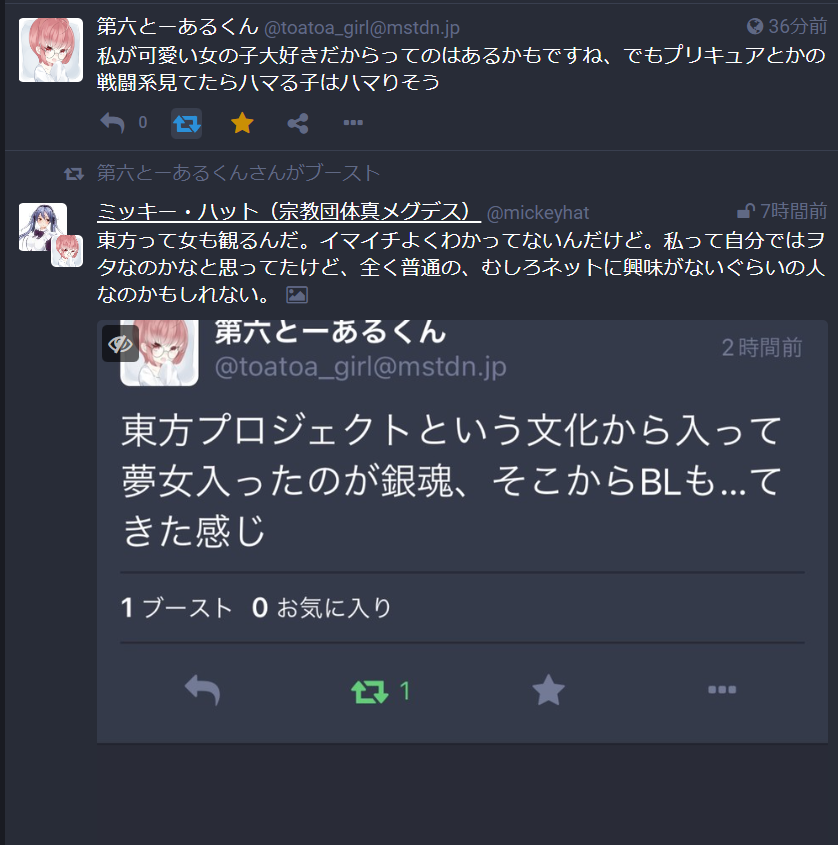 東方って女も観るんだ。イマイチよくわかってないんだけど。私って自分ではヲタなのかなと思ってたけど、全く普通の、むしろネットに興味がないぐらいの人なのかもしれない。 https://pawoo.net/media/ZicUH-6LoPJLHsI3JIM