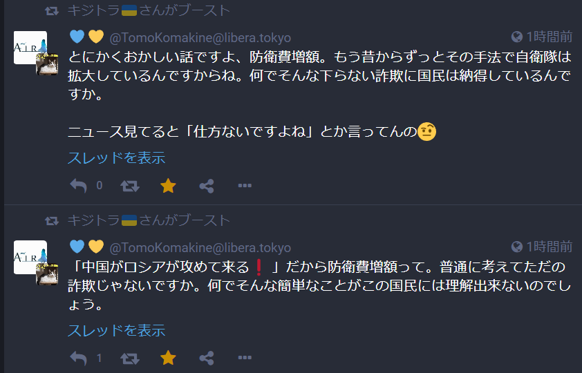 それでもなお、いずれ選挙になれば「立憲共産は売国! 消去法で自民一択!!」と国民はまだまだ自民党に勝利をもたらすのだろう。政治家たちの止まらない嘲笑の声が聞こえてくる。防衛費増額巡り 首相「国民自らの責任」 一部増税で賄う考え