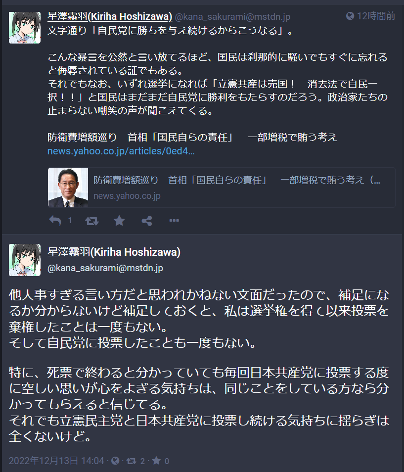 星澤霧羽(Kiriha Hoshizawa) (kana_sakurami@mstdn.jp)'s status on Wednesday, 14-Dec-2022 02:01:31 JST