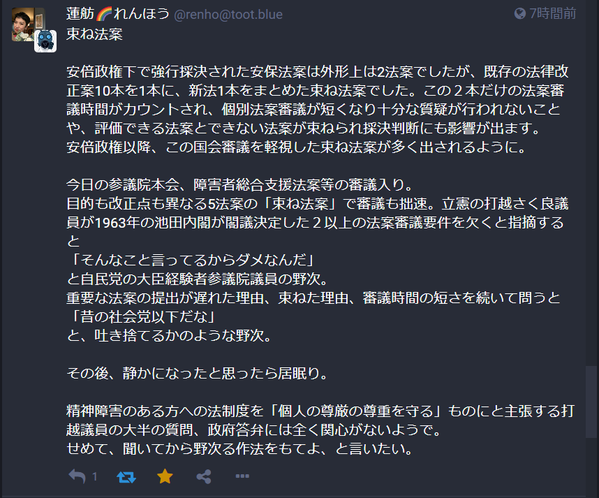 まあ、自民党側の野次ナシで蓮舫の意見を聞けるつーのは、貴重な体験かもな。