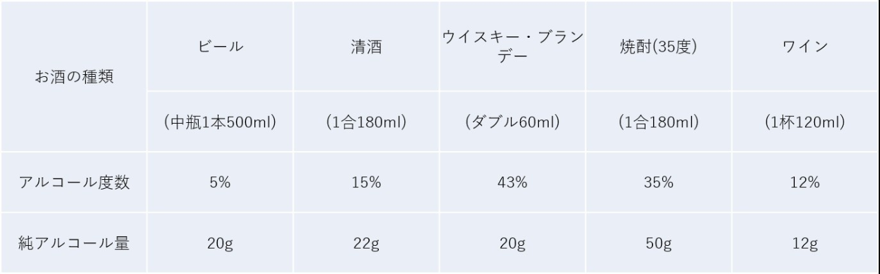 厚生労働省では「節度ある適度な飲酒」として「1日平均純アルコールで約20g程度」という指針を出している。
