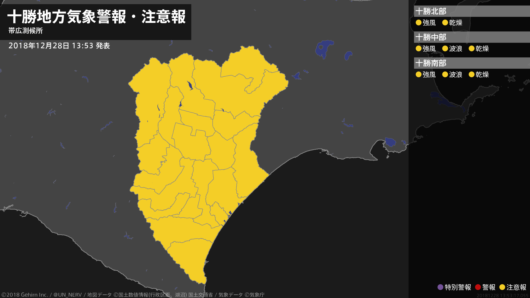【十勝地方 気象警報・注意報 2018年12月28日 13:53】