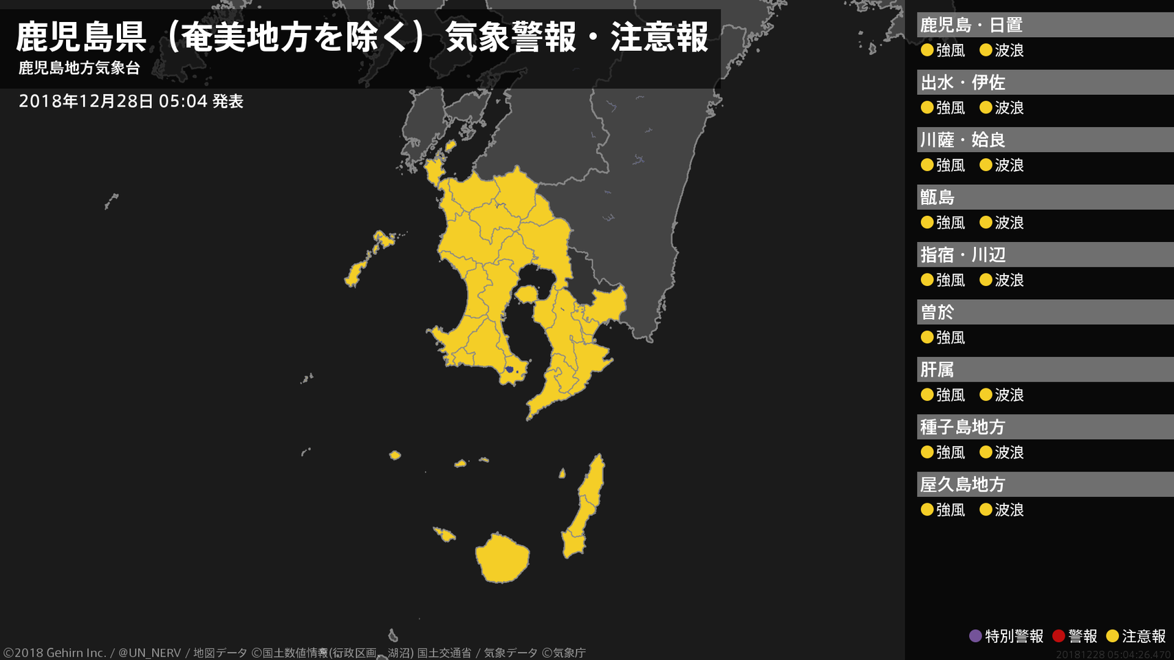 【鹿児島県(奄美地方を除く) 気象警報・注意報 2018年12月28日 05:04】