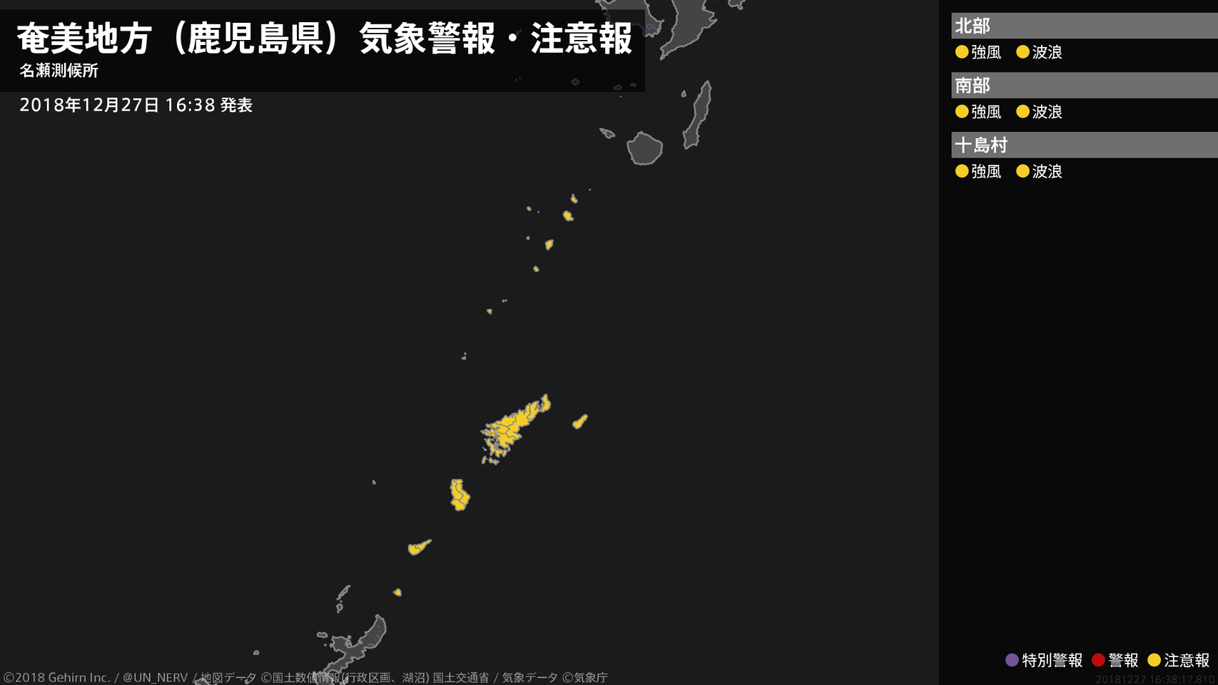 【奄美地方(鹿児島県) 気象警報・注意報 2018年12月27日 16:38】