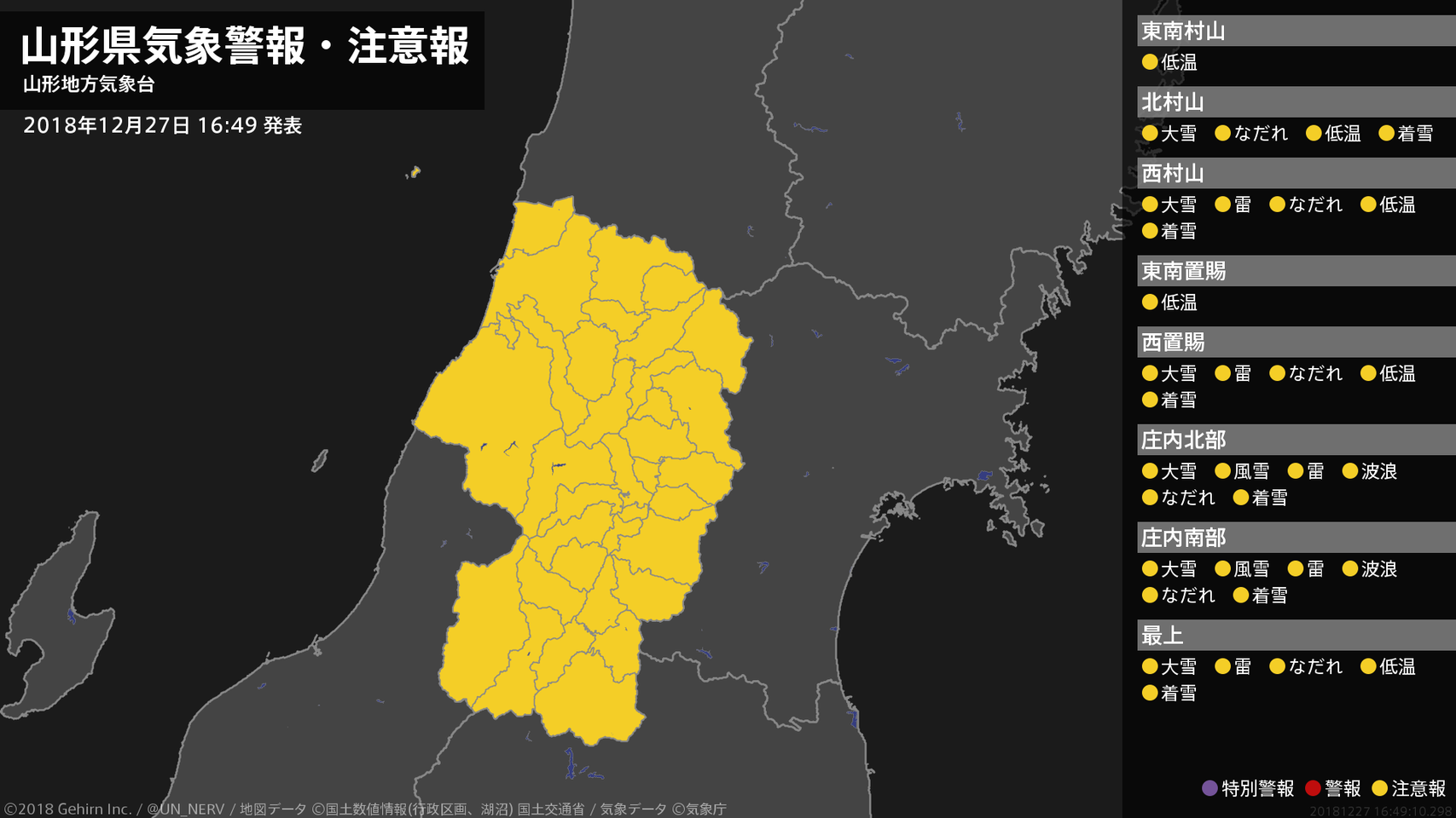 【山形県 気象警報・注意報 2018年12月27日 16:49】