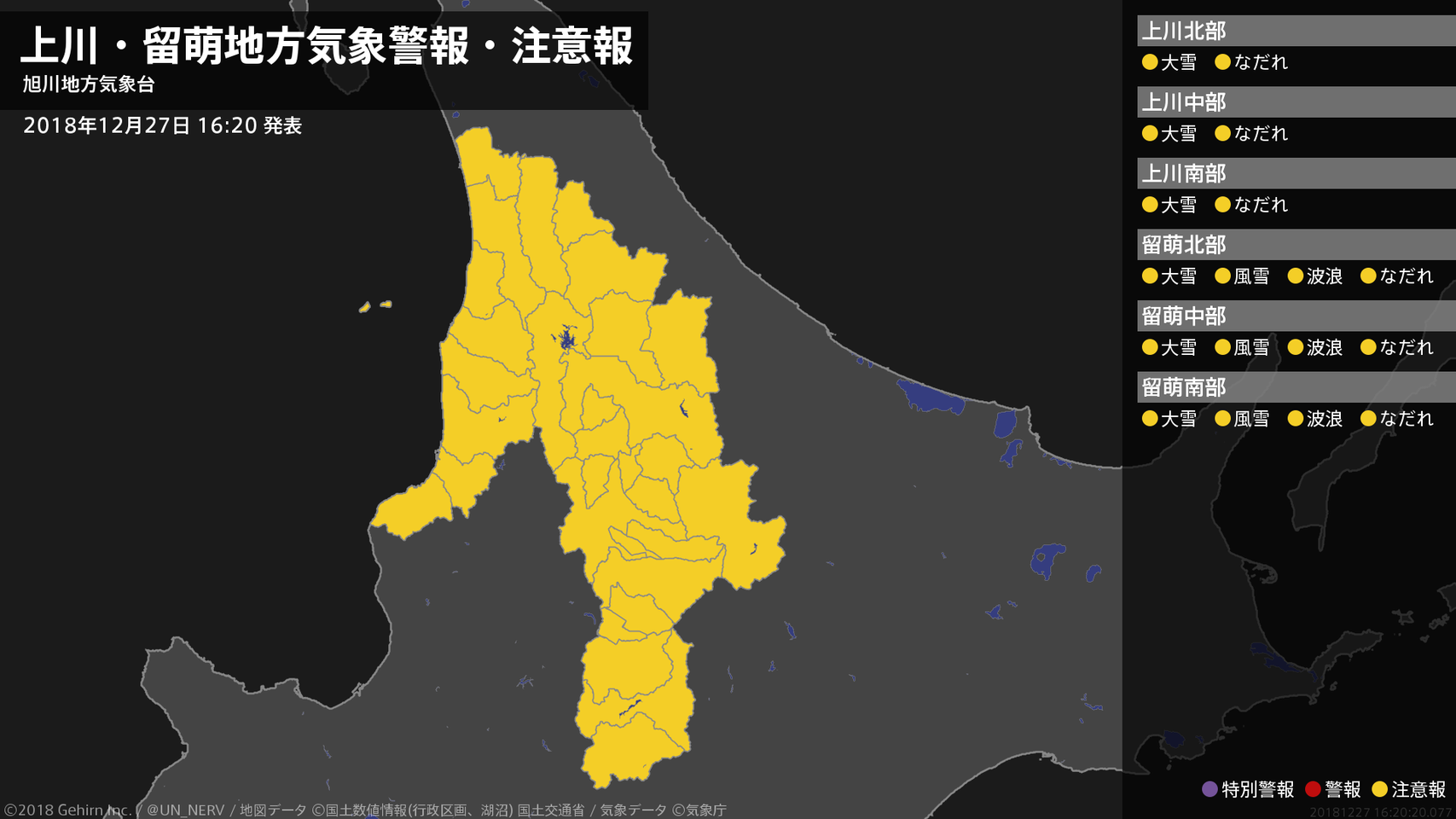 【上川・留萌地方 気象警報・注意報 2018年12月27日 16:20】