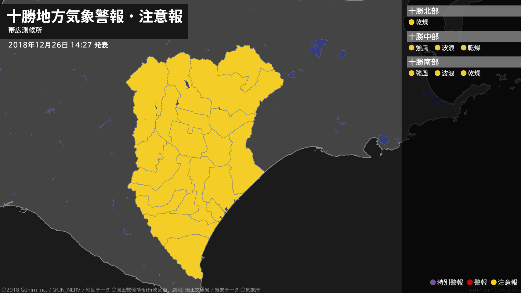 【十勝地方 気象警報・注意報 2018年12月26日 14:27】