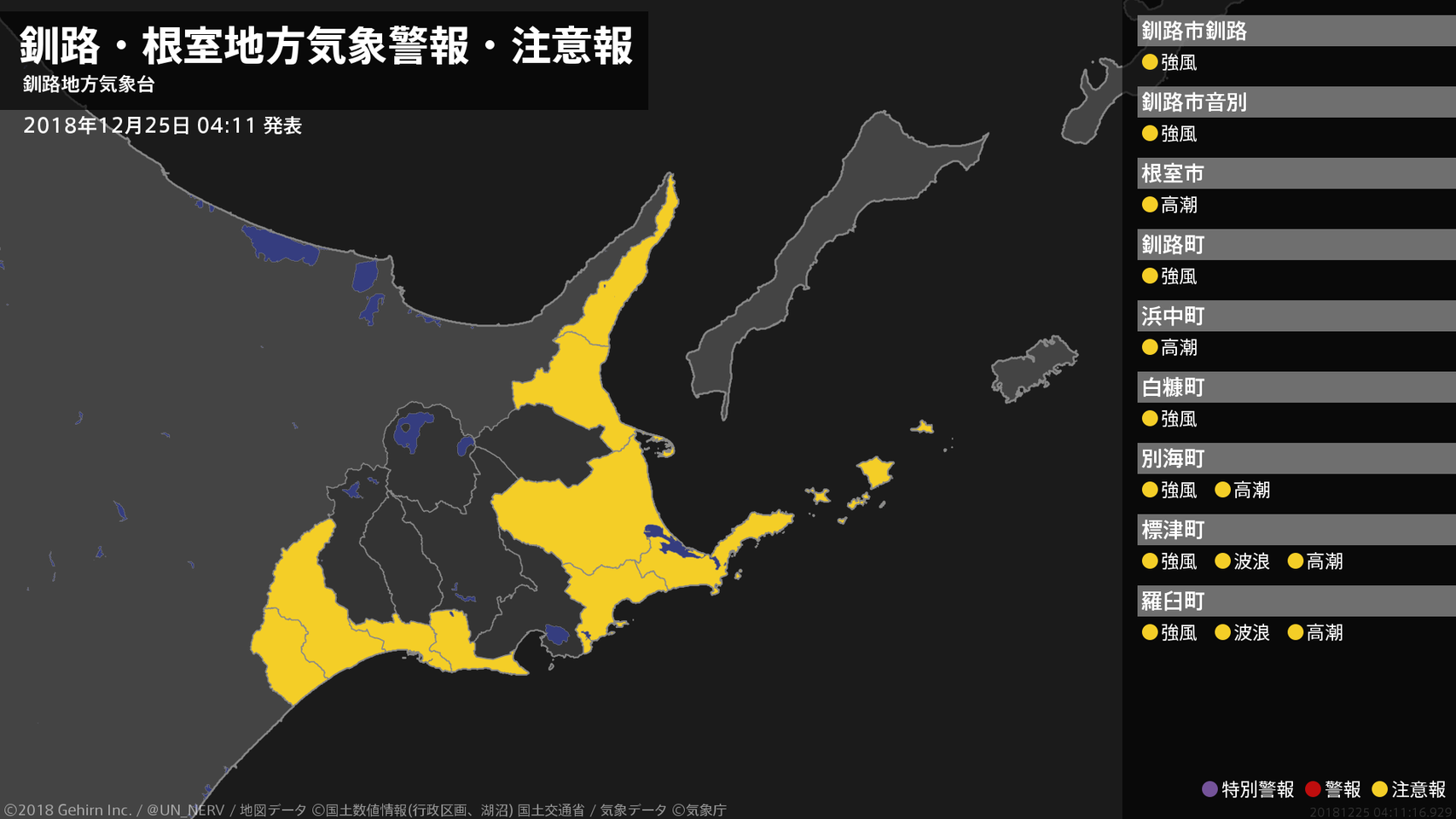【釧路・根室地方 気象警報・注意報 2018年12月25日 04:11】