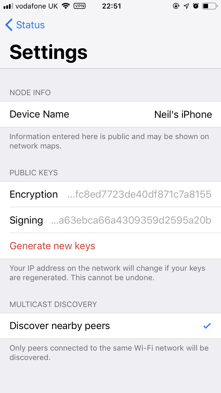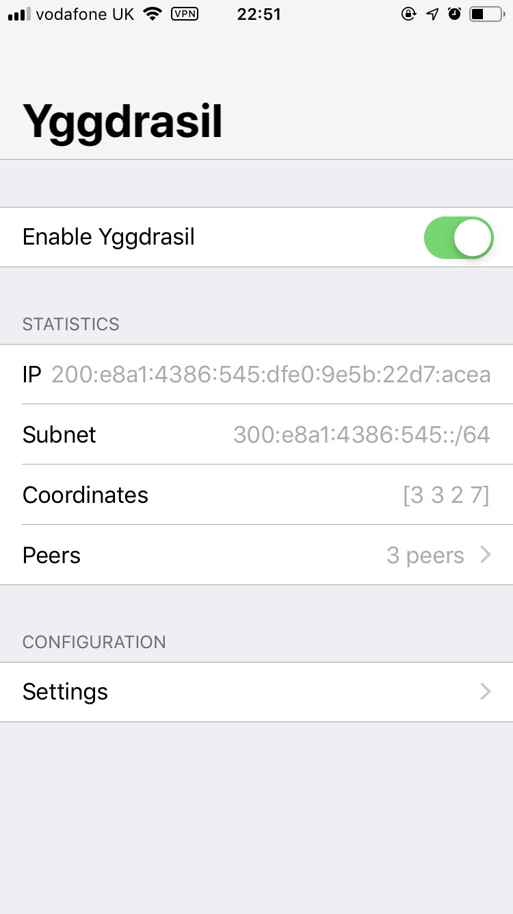 My project for the last few days has been porting #Yggdrasil to iOS. It's now running natively as a VPN Network Extension with a native Swift companion app - preview attached!
