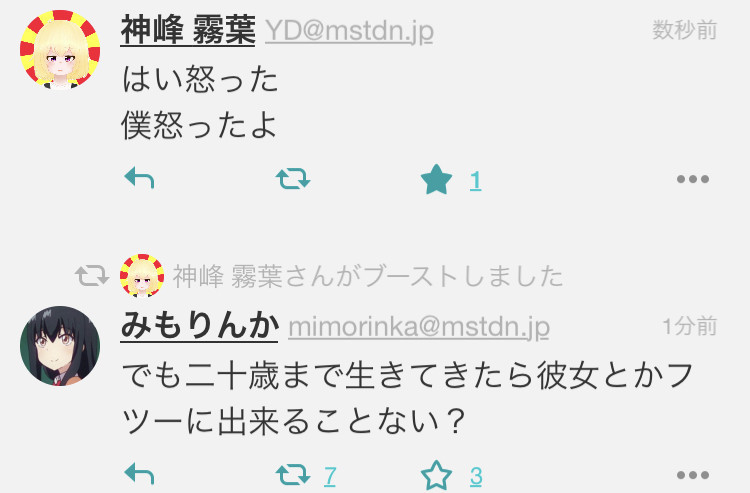 みもりんか (mimorinka@mstdn.jp@mstdn.jp)'s status on Tuesday, 15-Jan-2019 20:06:11 JST