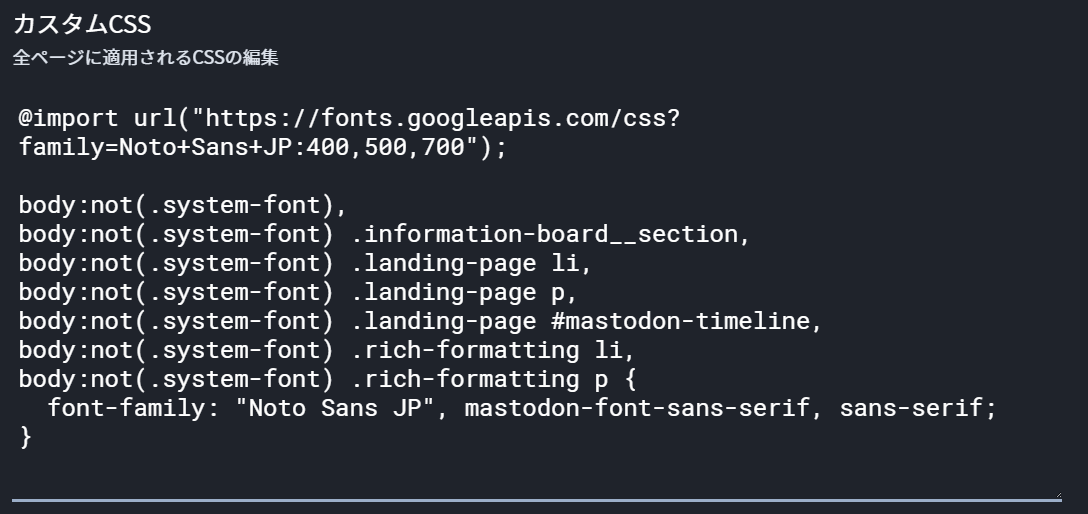 ykzts.technology のカスタムCSSにfont-familyの設定を追加してNoto Sans JPで表示されるようにしました。Web UIだけではなくpublic UIでも適用されるようになっているので、それなりの効果は得られるのではないかと思っています。