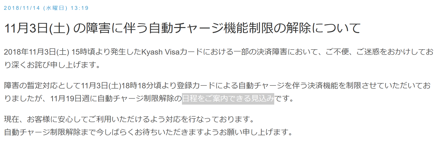 Kyashの復旧まだかなーと思ったけど,よくよく読んでみたらどこにも19日の週に復旧するとは書いてないな…?