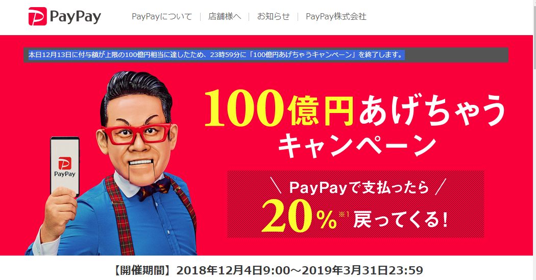"本日12月13日に付与額が上限の100億円相当に達したため、23時59分に「100億円あげちゃうキャンペーン」を終了します。"